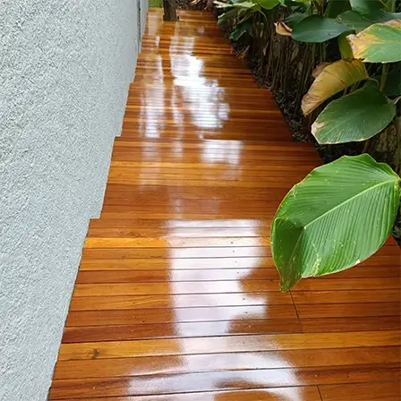 Com tonalidade mais rosada, porém sem perder a força e presença que a cor Cumaru tem. O acabamento é castanho-claro avermelhado com brilho moderado.